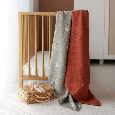 Estimated delivery in 5 days.Snuggle up in natural comfort with this beautifully coordinated baby bundle featuring our Forest Deer muslin swaddle and terra cotta 4-ply muslin blanket. Both pieces are made from breathable organic cotton — one lightweight and airy, the other soft and plush for versatile daily use.
